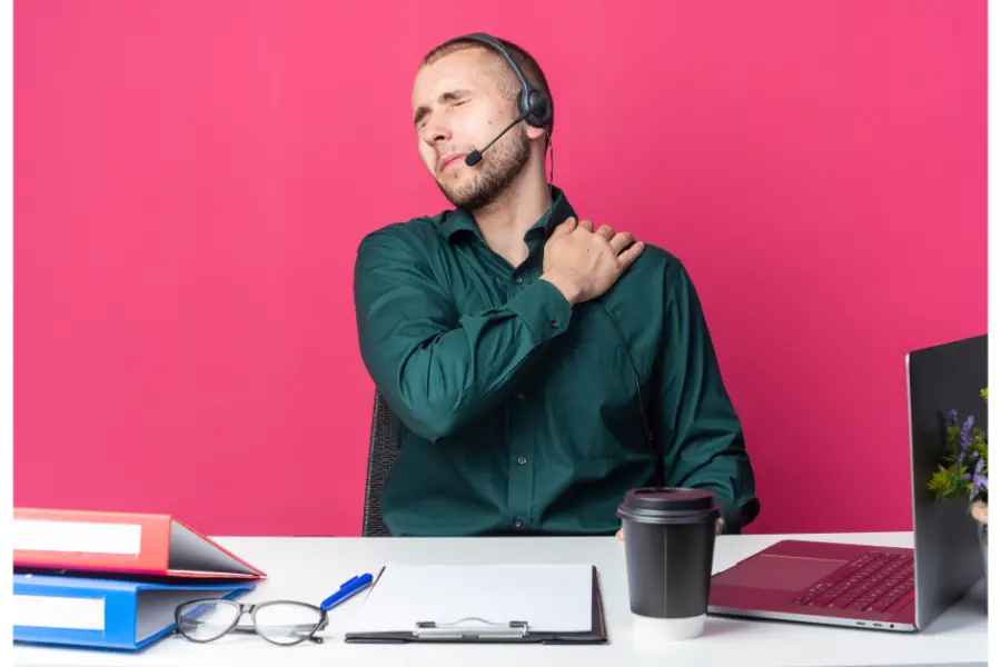 - Zeurende pijn: Een branderig of vermoeid gevoel in de nek en bovenrug aan het eind van de werkdag.