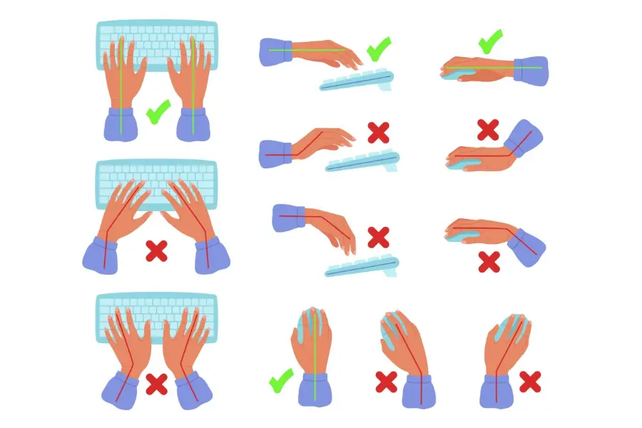 Wanneer je polsen te ver buigen tijdens het typen of muizen, ontstaat extra druk op de pezen.